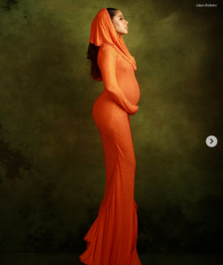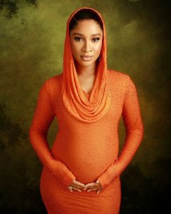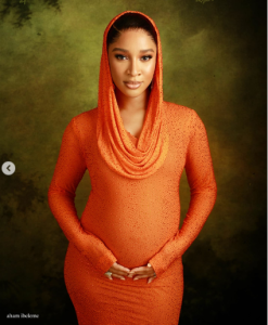 In the photos, Adesua looked radiant in a vibrant orange dress with a hood, lovingly cradling her baby bump as she celebrated the special moment with her fans.