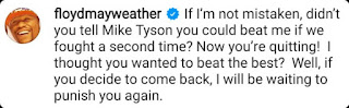 “If I’m not mistaken, didn’t you tell Mike Tyson you could beat me if we fought a second time? Now you’re quitting! I thought you wanted to beat the best? Well, if you decide to come back, I will be waiting to punish you again.”