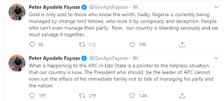 Fayose in his tweets shared on Saturday night, said Nigeria is currently being managed by “strange bedfellows” who took it by conspiracy and deception. He stated that what is happening to the APC in Edo State is a pointer to the “helpless situation the country is currently in.”