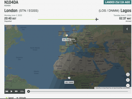 The jet left Nigeria on Monday, June 1, 2020 at about 8pm Nigerian time and arrived in the UK at 2:37am.