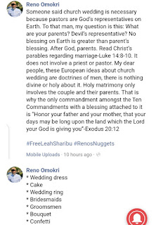He wrote : ”Someone said church wedding is necessary because pastors are God’s representatives on Earth. To that man, my question is this: What are your parents? Devil’s representative? No blessing on Earth is greater than parent’s blessing.”