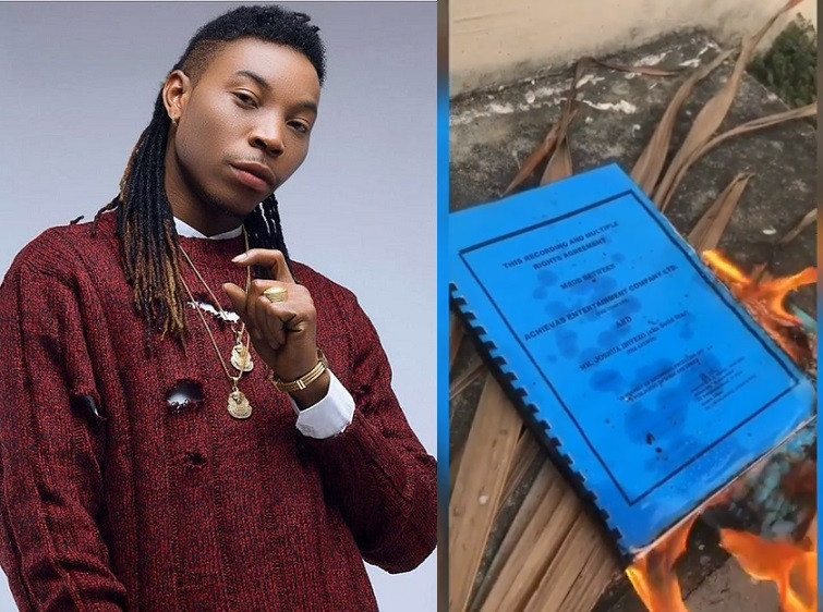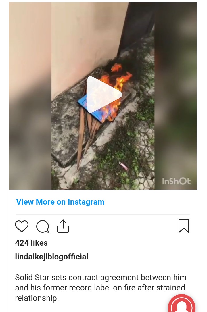 Nigerian singer, Solid Star has shocked his fans by setting the contract agreement he had with his former record label, Achievas Entertainment on fire.