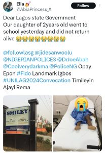 She explained that her daughter, a student of Smiley Kids Montessori, in Sangotedo, Lagos State, went to school healthy but did not return alive.