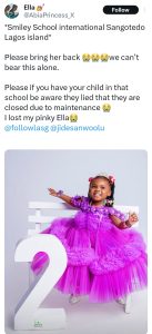 She explained that her daughter, a student of Smiley Kids Montessori, in Sangotedo, Lagos State, went to school healthy but did not return alive.