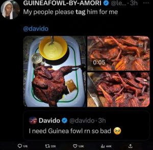 Among them was a vendor known as “GUINEAFOWL-BY-AMORI,” who took advantage of the situation by sharing photos and videos of her guinea fowl business and urging her followers to help her tag Davido.