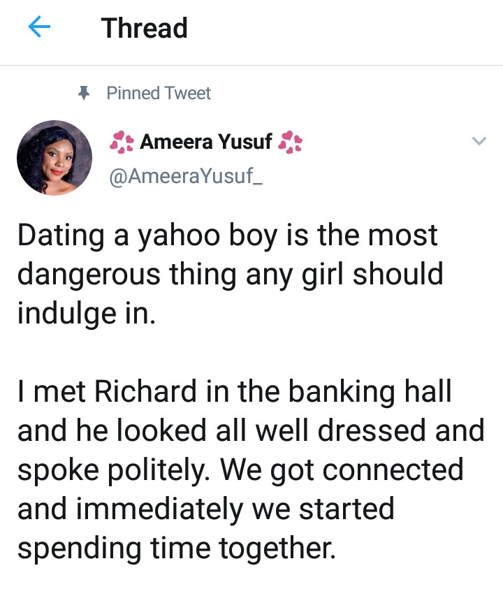 According to @ameerayusuf, her boyfriend deceived her into believing that he is into real estate, meanwhile lured her to Asaba to use her for money ritual.