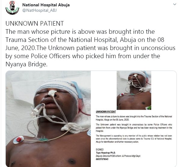 UNKNOWN PATIENT The man whose picture is above was brought into the Trauma Section of the National Hospital, Abuja on the 08 June, 2020.The Unknown patient was brought in unconscious by some Police Officers who picked him from under the Nyanya Bridge.